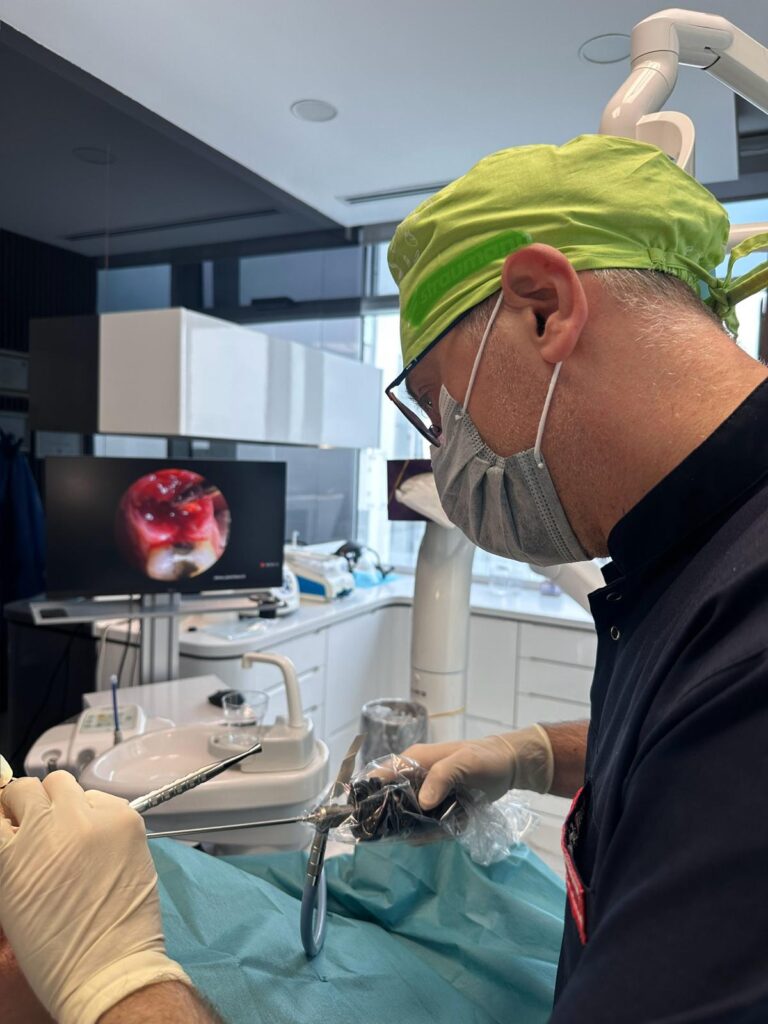 Kliniğimizde sinüs ve implant cerrahilerinde, cerrahi alanın detaylı ve kontrollü şekilde değerlendirilebilmesi amacıyla MNT endoskop sistemi kullanılmaktadır. Endoskopik görüntüleme teknolojisi, sinüs boşluğu ve implant cerrahi sahasının yüksek büyütme ve güçlü aydınlatma ile net biçimde izlenmesini sağlar.